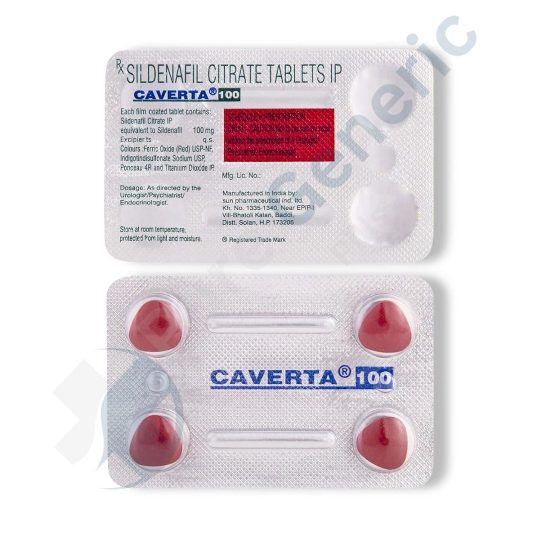 Caverta 100 mg is a prescription medication used to treat erectile dysfunction (ED) in men. It contains sildenafil citrate, the same active ingredient as in Viagra, which improves blood flow to the penis. This helps men achieve and maintain firm erections during sexual activity, enhancing sexual performance, confidence, and satisfaction. The 100 mg dose is suitable for men who need a standard-to-strong dose for optimal results.