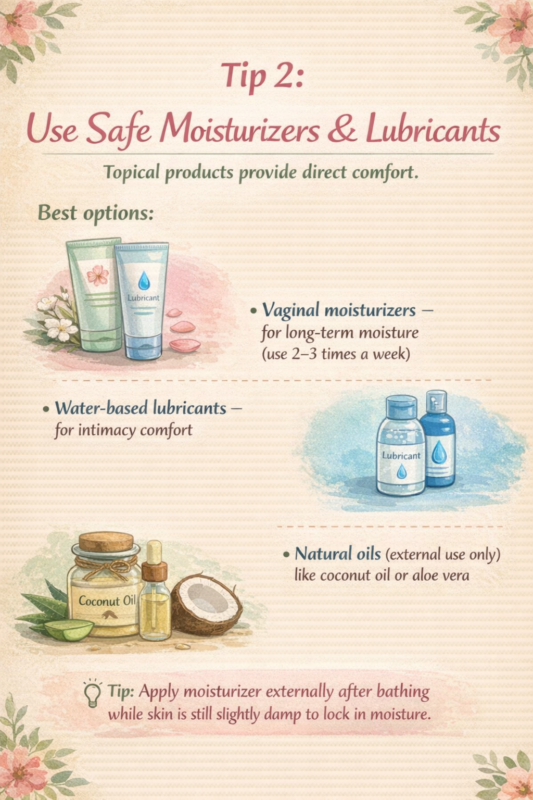 - Vaginal moisturizers – for long-term moisture (use 2–3 times a week)